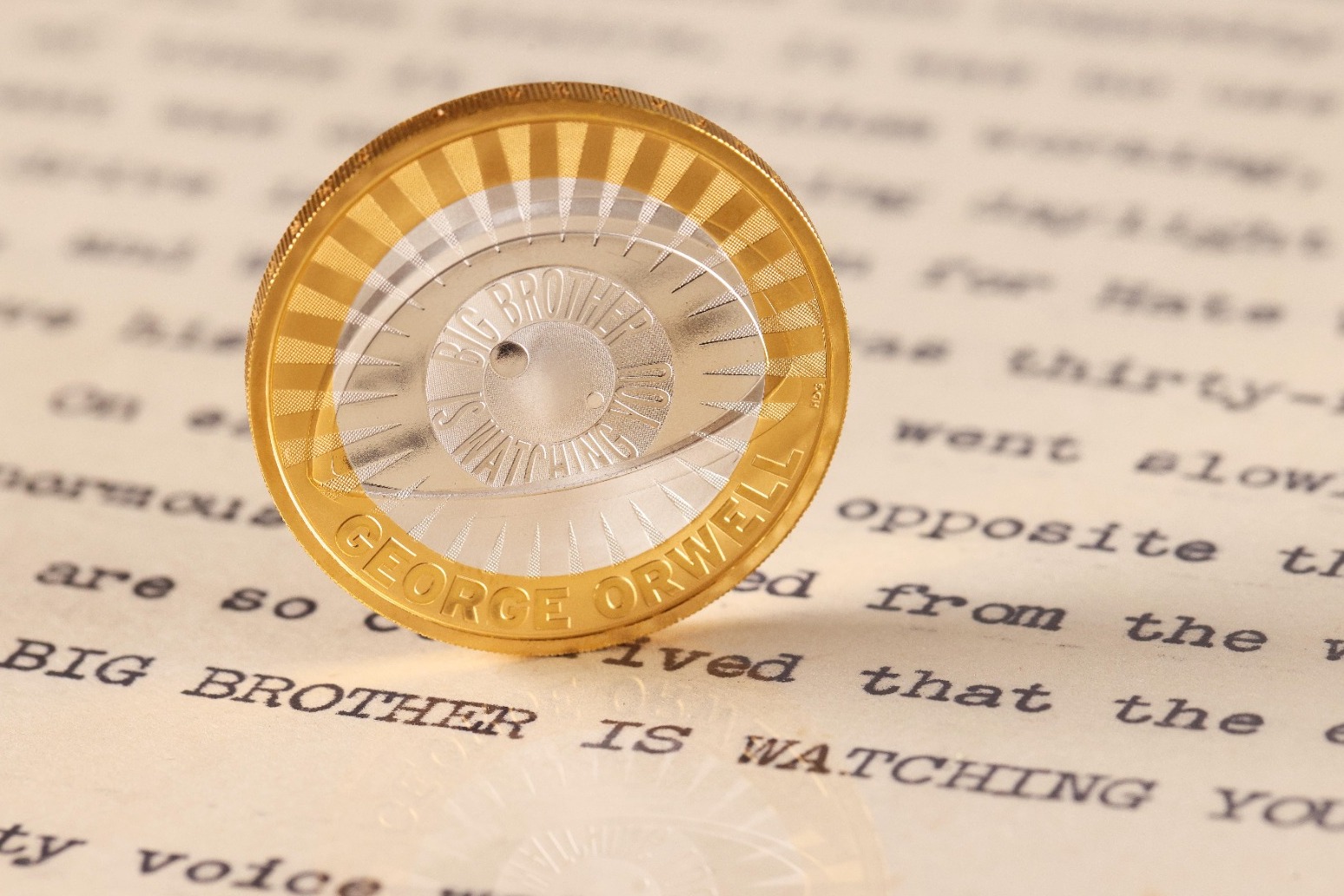 The quote “Big Brother is watching you” encircles the camera lens, while the coin’s edge inscription bears another quote: “There was truth and there was untruth.”