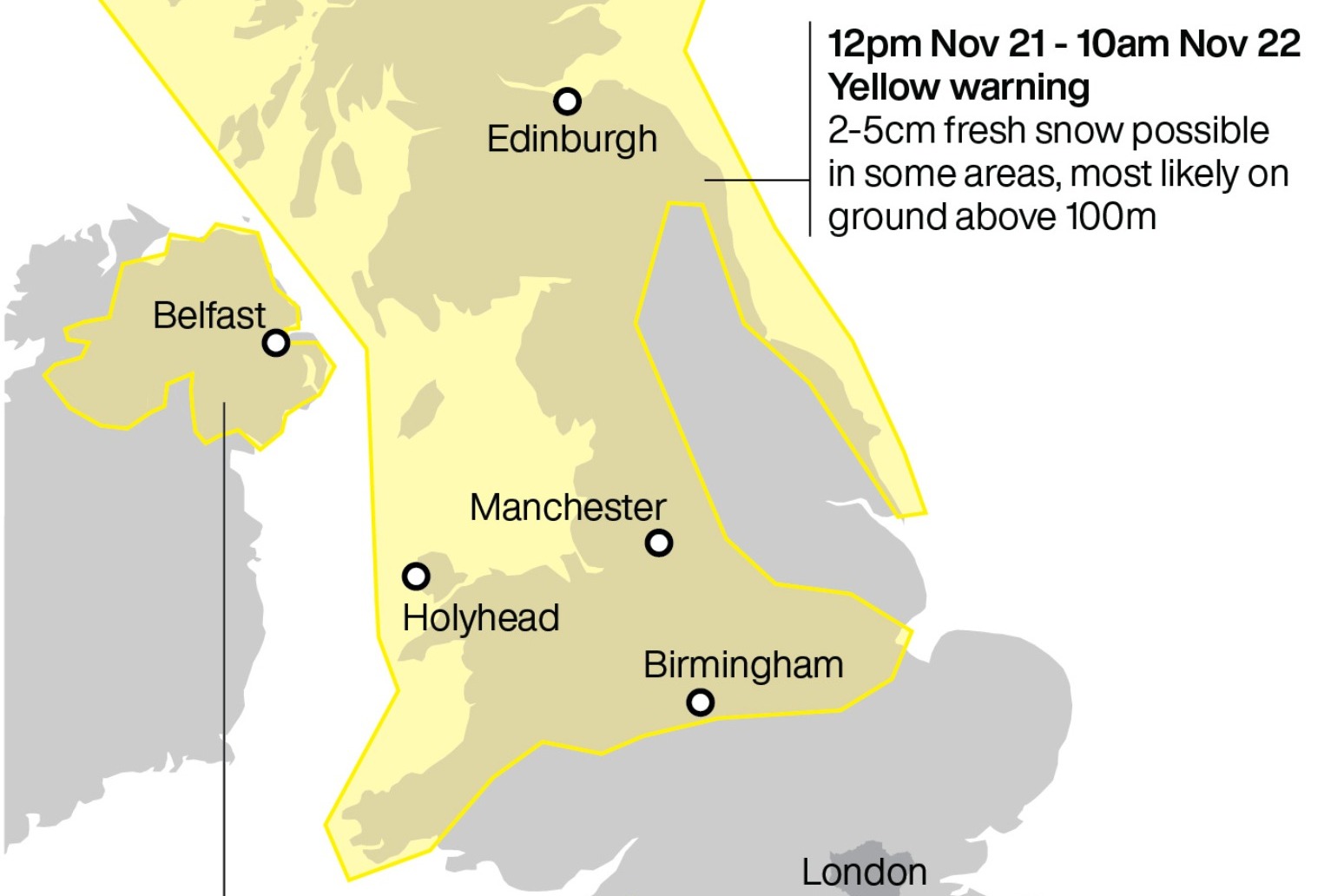There is already a yellow warning for heavy snow on Saturday followed by a “rapid thaw” and rain on Saturday night in north-east and north-west England, the West Midlands, Yorkshire, and much of Scotland.