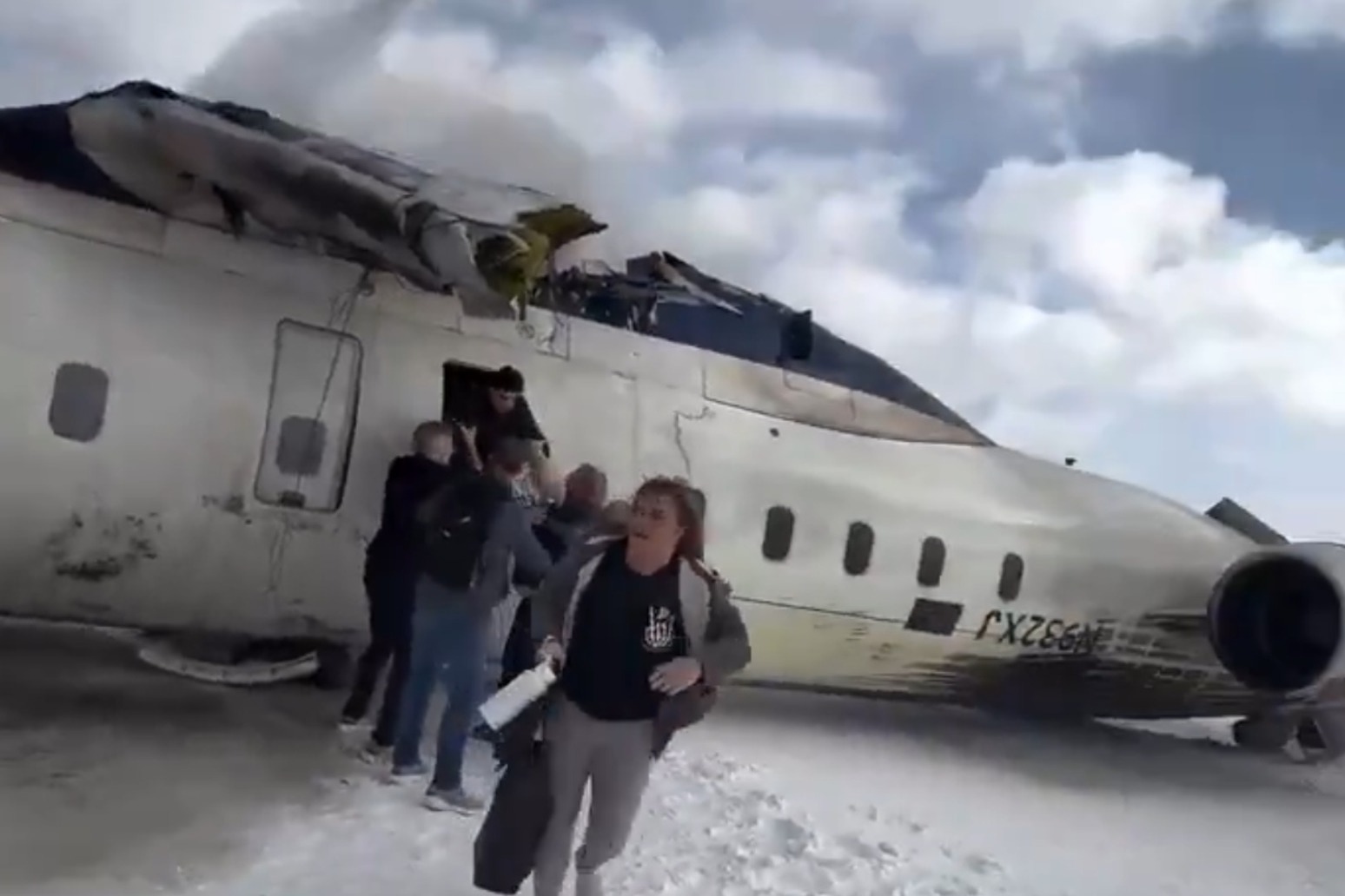 Video from the scene shows the Mitsubishi CRJ-900LR upside down on the snowy tarmac as emergency workers hose it down. The plane was somewhat obscured by snow from a winter storm that hit Toronto over the weekend.