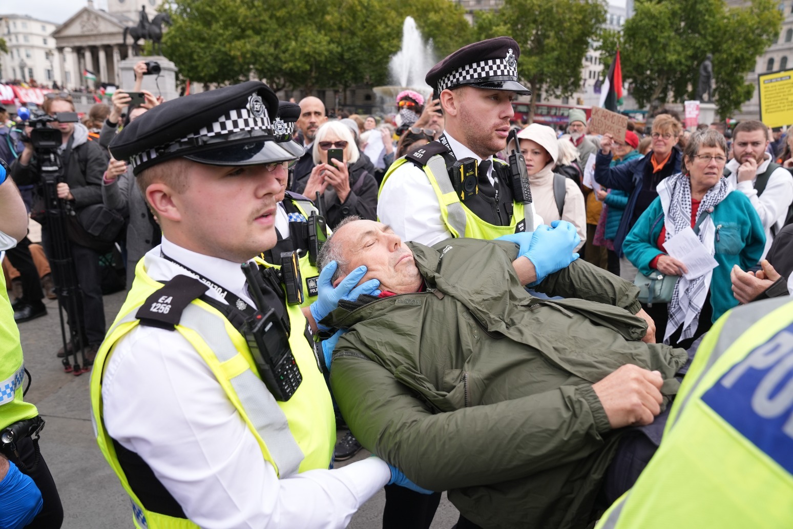 Officers have made arrests in Trafalgar Square where people are holding placards in support of Palestine Action and at Westminster Bridge where a banner backing the proscribed group was unfurled, the Metropolitan Police said.