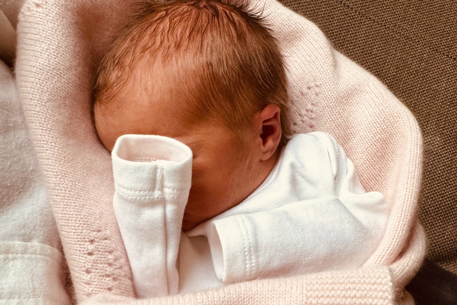 Beatrice and Mr Mapelli Mozzi released a photograph of their daughter taken by Mr Mapelli Mozzi, showing Athena with dark hair, wearing a white long-sleeved garment, and wrapped in a pink blanket with her face hidden by her arm.