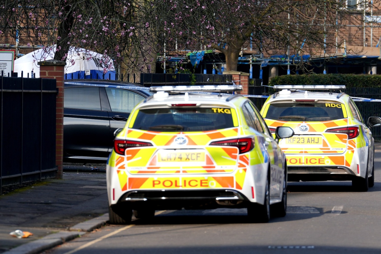 A crime scene and cordons remain in place, with several police cars and officers stationed nearby.
