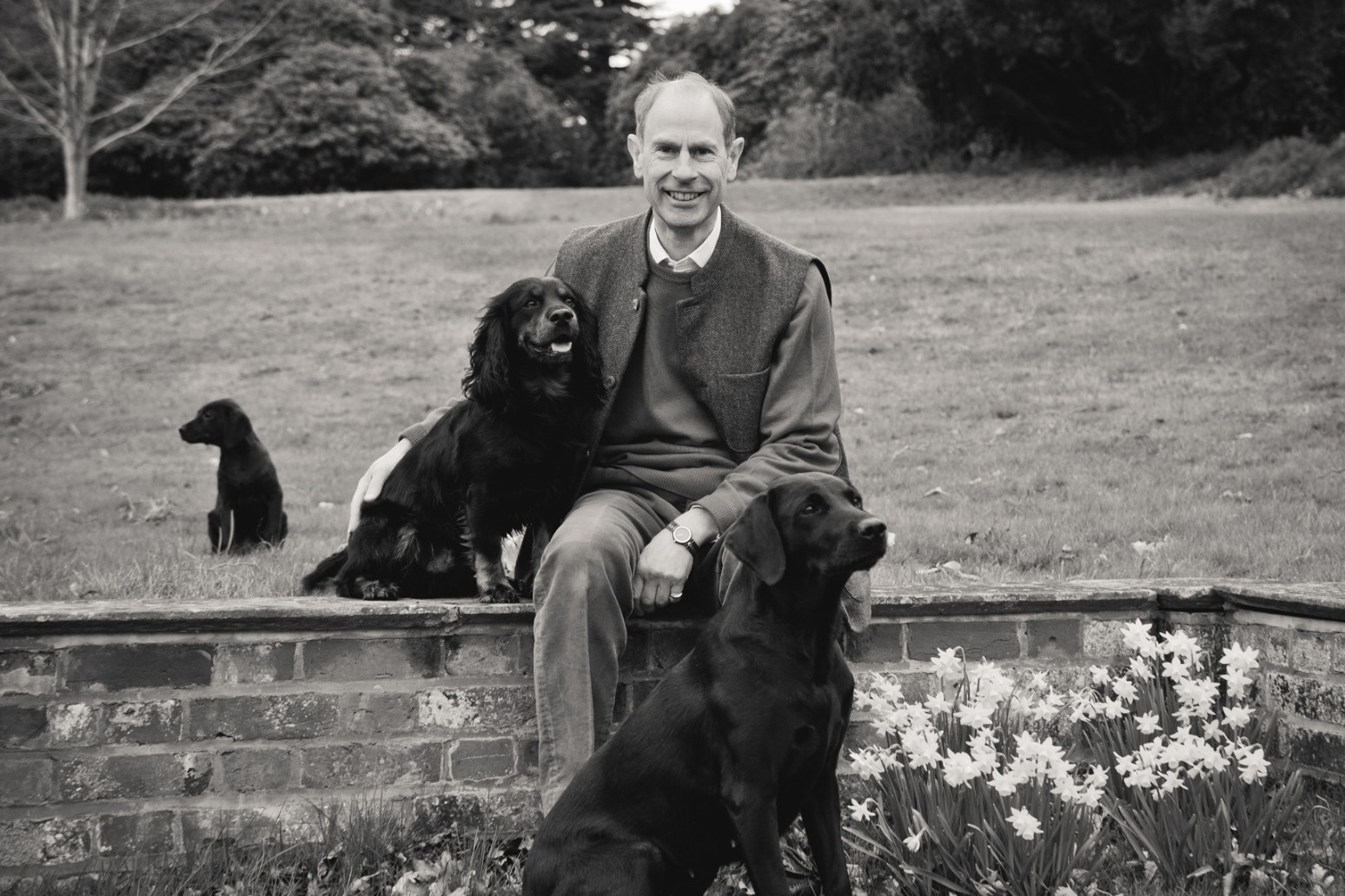 In newly released images, Edward is pictured wearing a red jumper underneath a dark buttoned waistcoat, and smiling with his three dogs, Labrador Teal, cocker spaniel Mole and Labrador puppy Teasel.