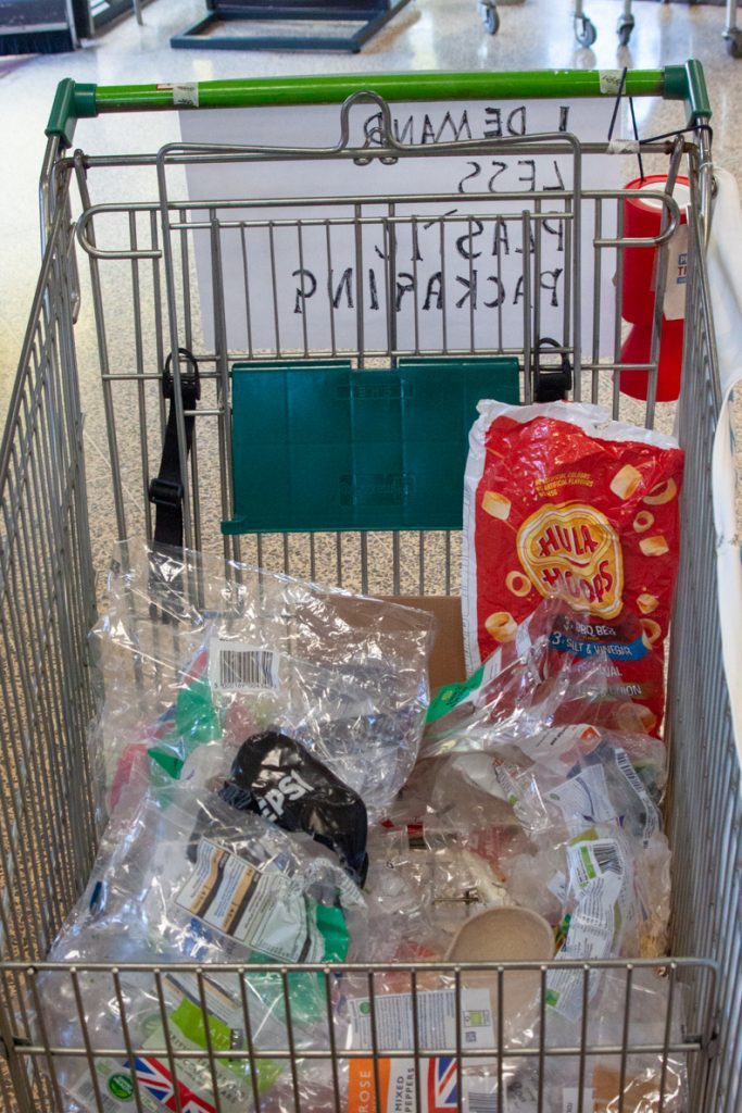 A team of eco warriors visited Waitrose in Thatcham with a mission to educate customers on how to recycle excess packaging from items bought from supermarkets. The team from West Berkshire Eco Friends was encouraging customers to leave their unwanted plastic packaging once they’d done their shopping. Customers were removing excess wrapping from their shopping and leaving it in a trolley with the Eco Friends.