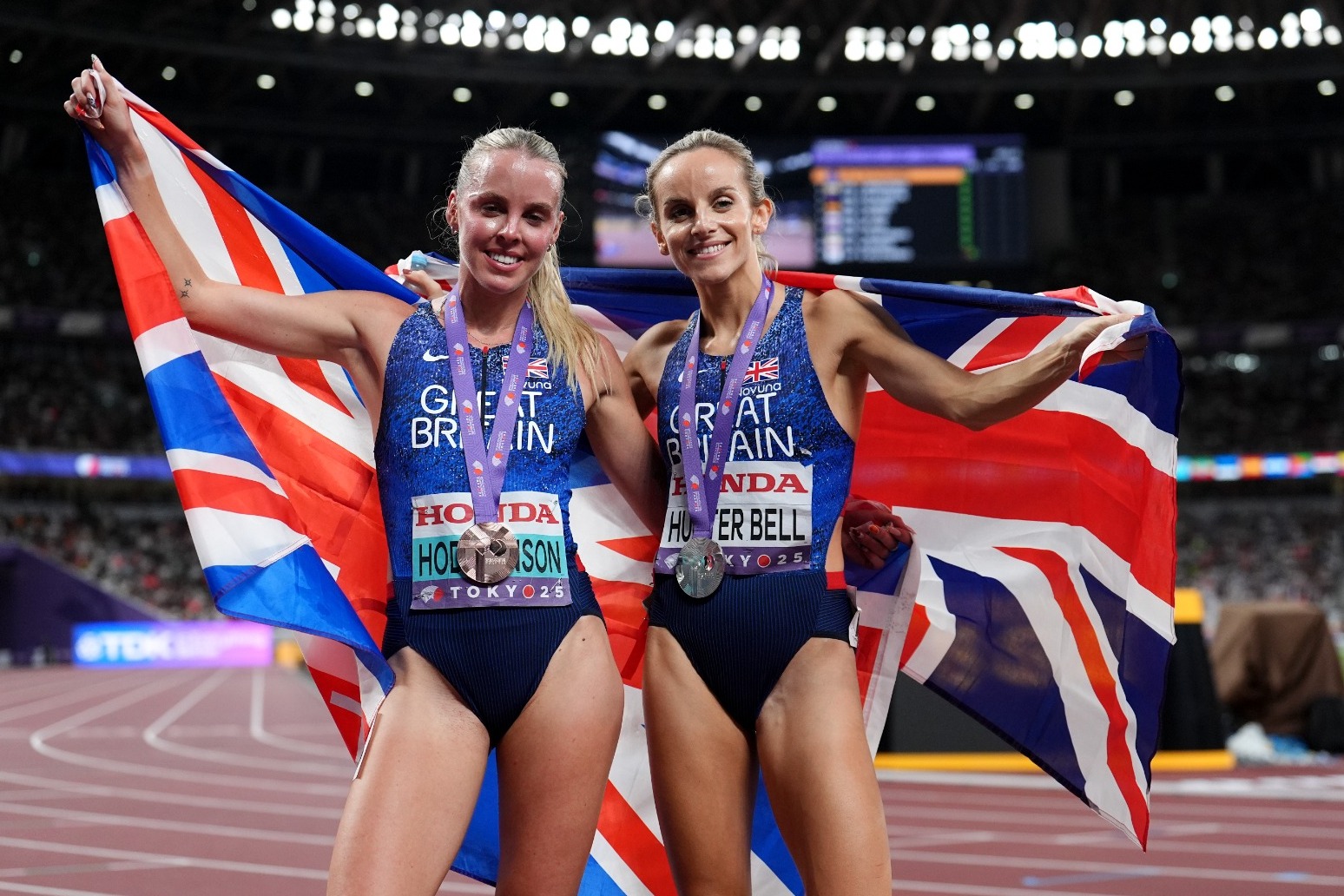 Georgia Hunter Bell pipped training partner and Olympic champion Keely Hodgkinson to an 800 metres silver medal by one one hundredth of a second on the final night of action at the World Athletics championships in Tokyo.