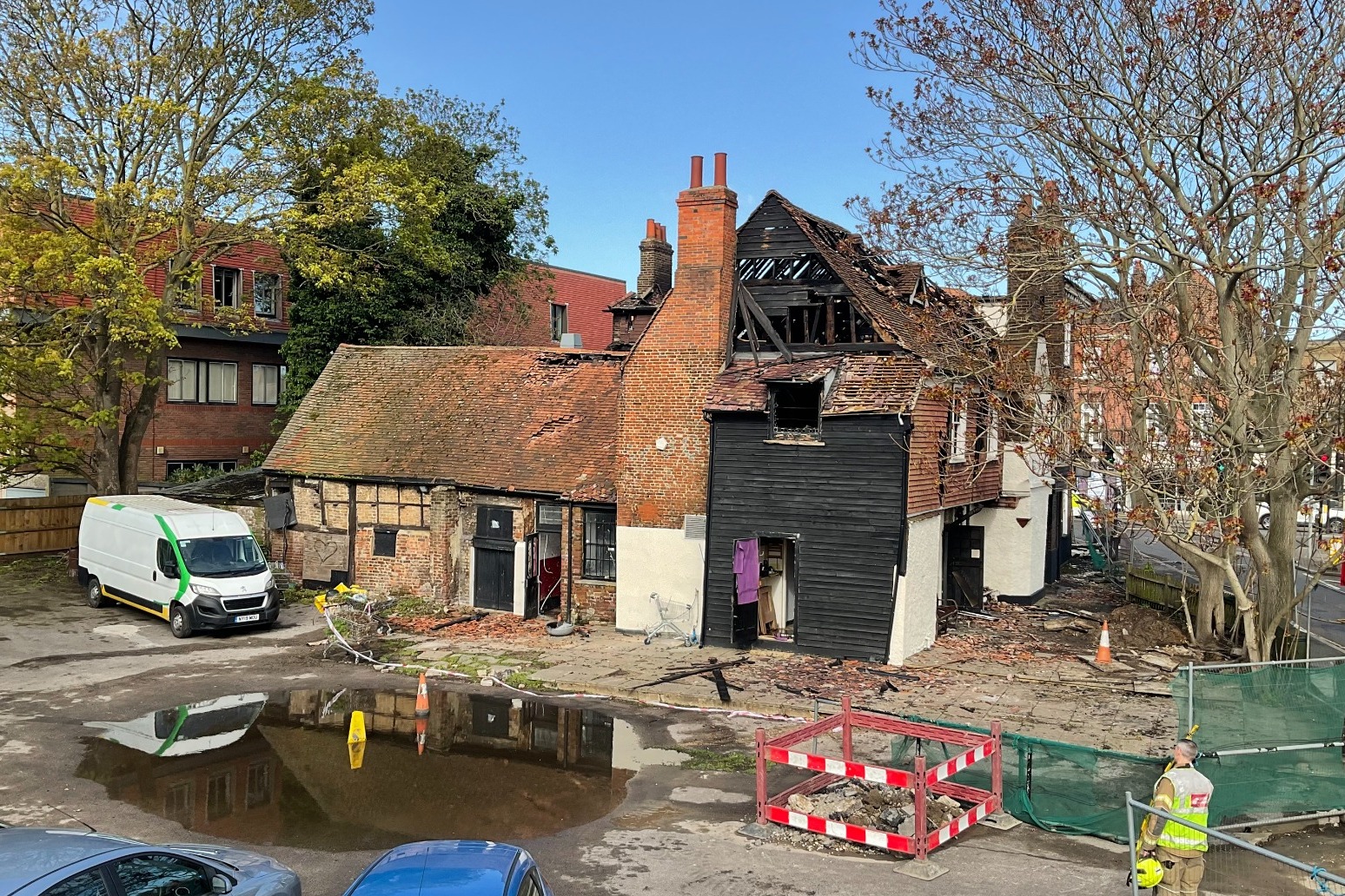The blaze on Friday night damaged three floors and destroyed the roof of the grade II-listed Burn Bullock in Mitcham, south-west London, that was reportedly visited by a British king.