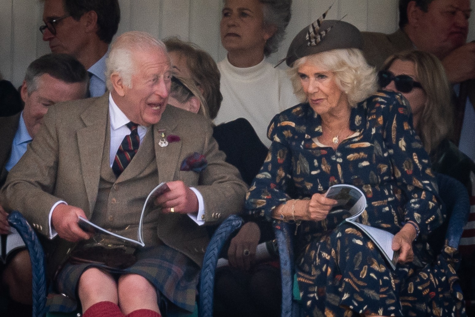The King and Queen smiled as they attended the annual Braemar Gathering Highland Games in Scotland, one day before his accession anniversary.