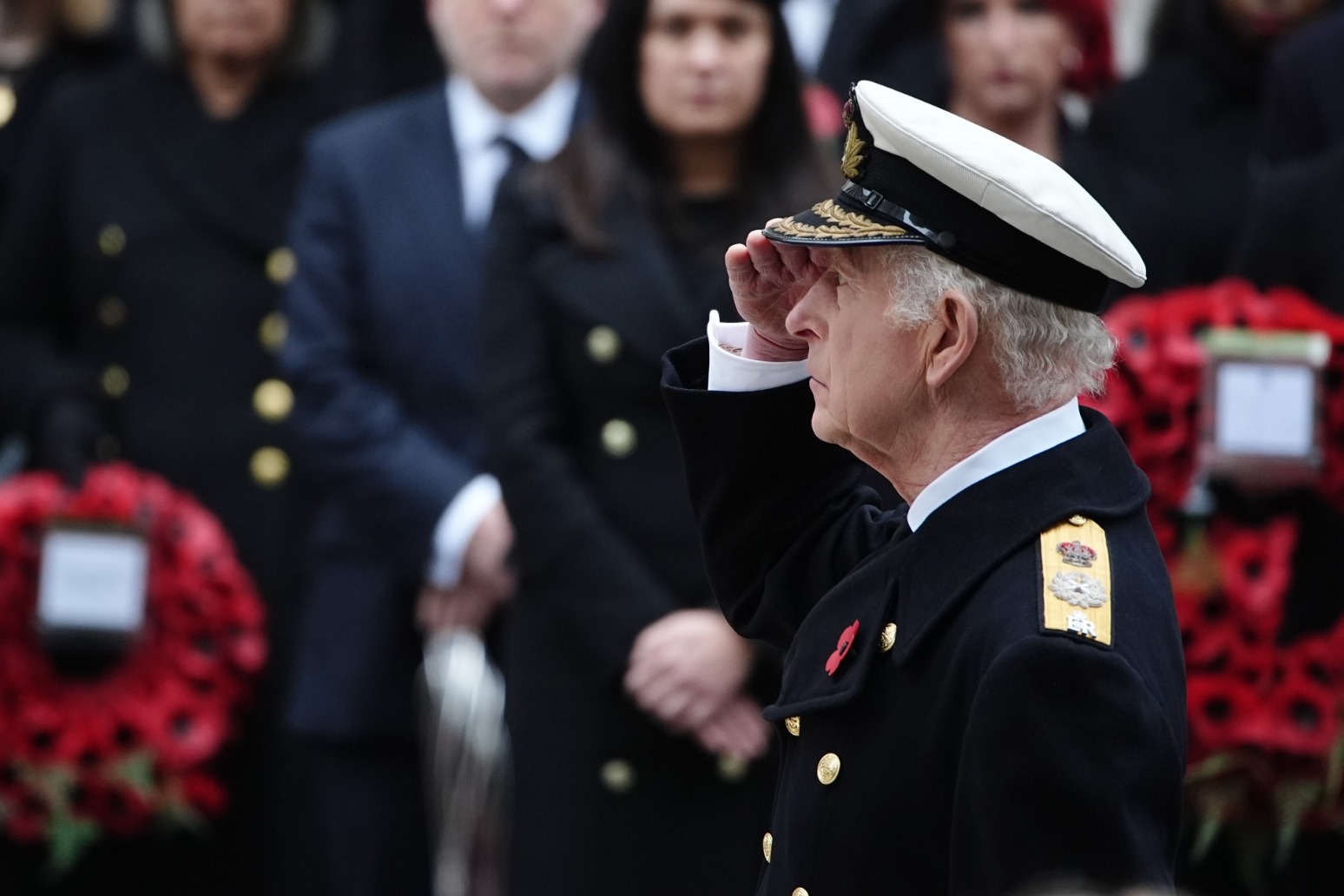 Charles wore military dress, as did the other royals, and after laying his wreath he saluted in his greatcoat worn over his uniform of an Admiral of the fleet, with a sword by his side.