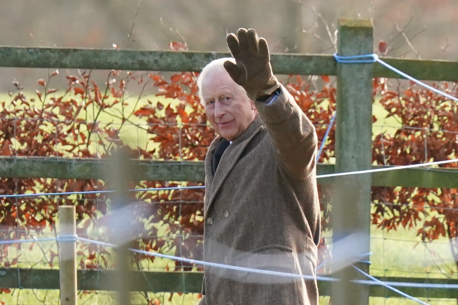 The King has been pictured waving to well-wishers after attending a church service on his Norfolk estate.