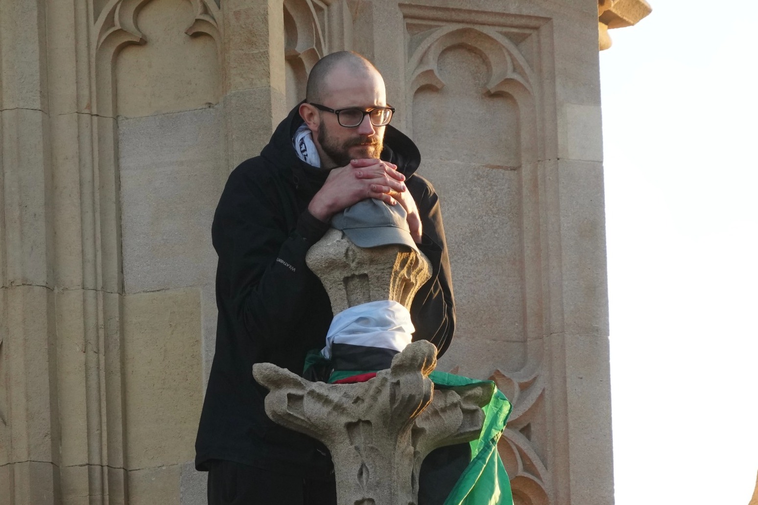 A man has been arrested after spending more than 16 hours barefoot and holding a Palestine flag while perched on the clock tower of Big Ben.