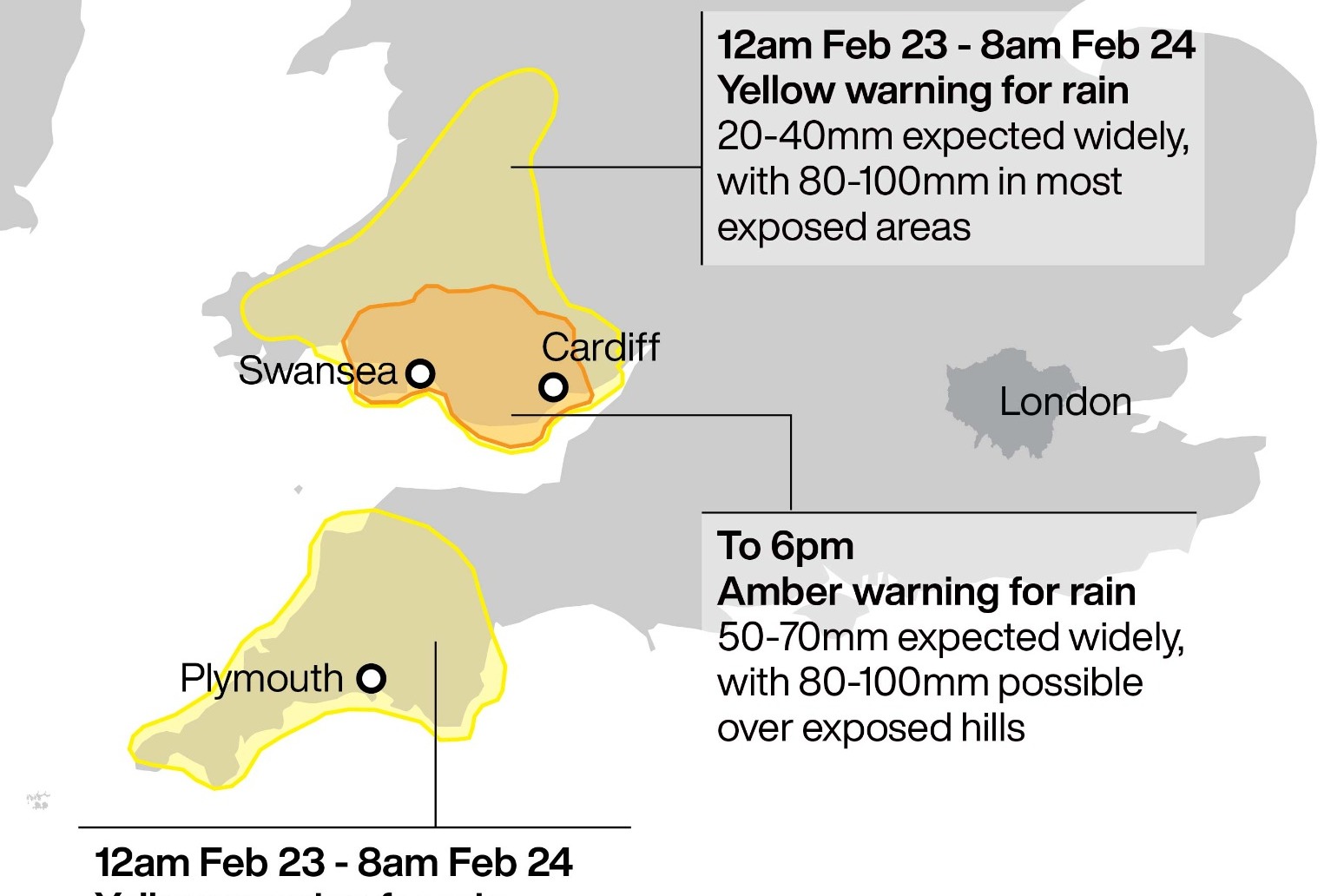 Yellow weather warnings for rain came into force for the south-west of England and much of Wales from midday on Sunday until 8am on Monday, and in Cumbria from 10am to 7pm on Sunday.