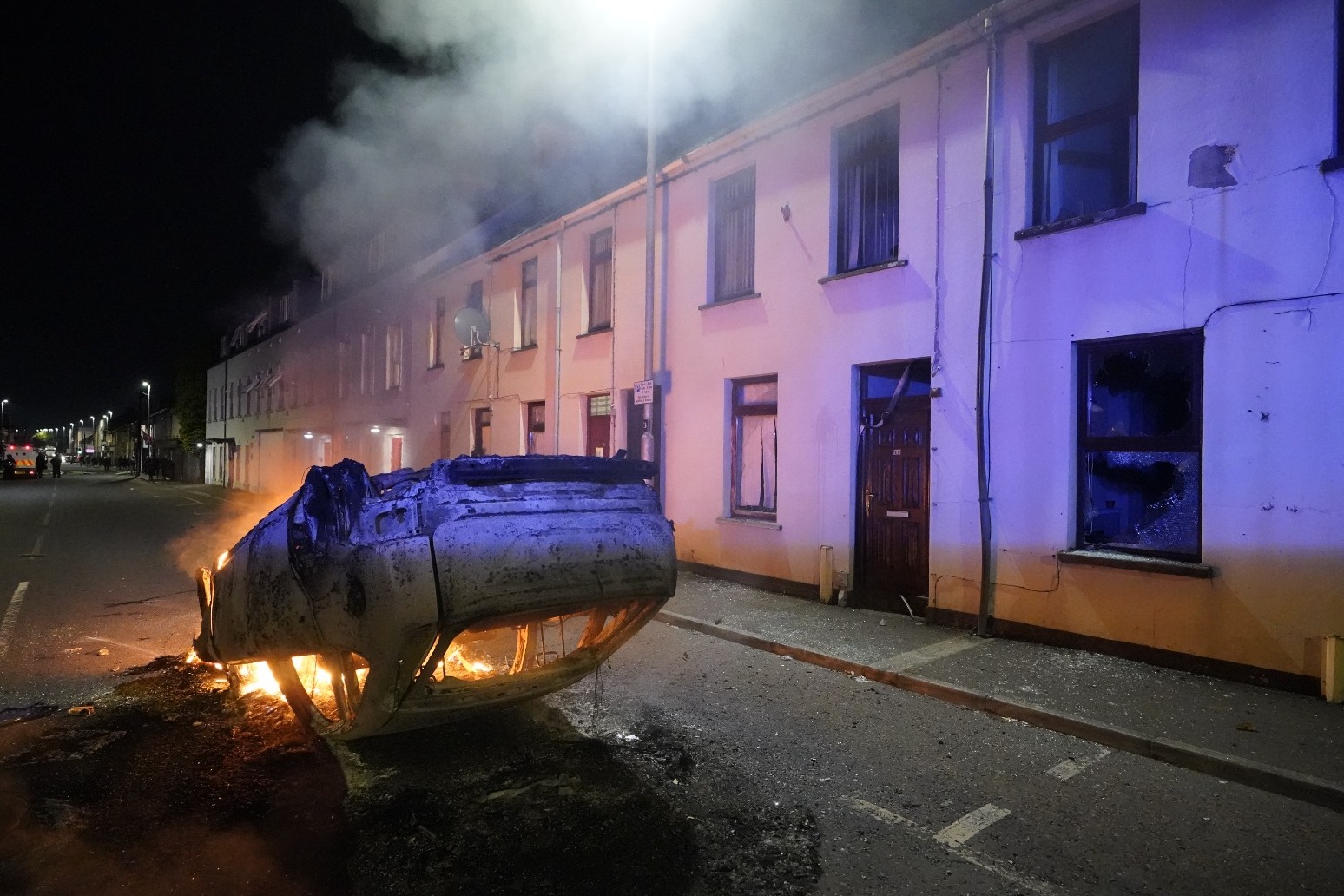 Multiple cars were also set on fire as part of blazes set by rioters, including near a car wash and tyre centre off Bridge Street and on Larne Street.