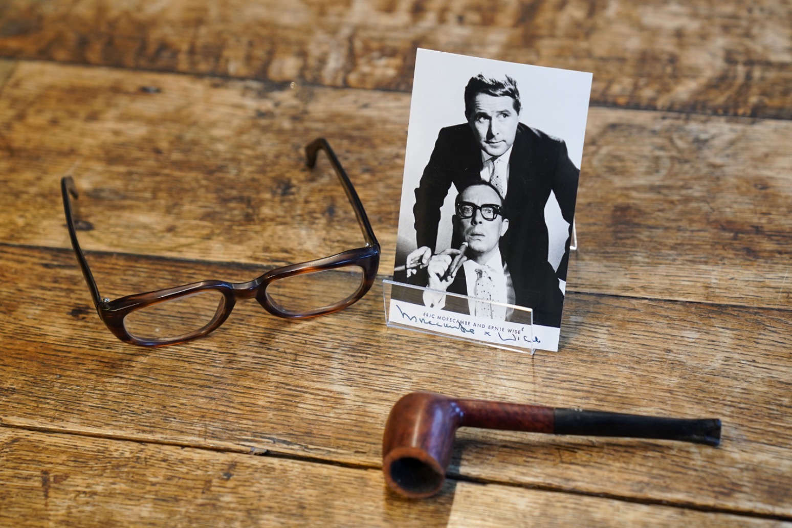 The imitation tortoiseshell glasses by Metzler, said to be synonymous with Morecambe’s sharp wit and comedic persona, were sold alongside his Barling briar pipe and two black-and-white photographs of him with the spectacles.