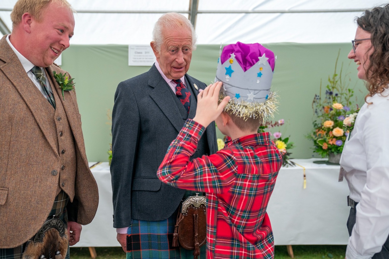 The King laughed as Oliver Keith tried on the homemade creation of silver cardboard, purple tissue paper and golden tinsel at the Royal Horticultural Society of Aberdeen’s 200th anniversary show in the city’s Duthie Park.